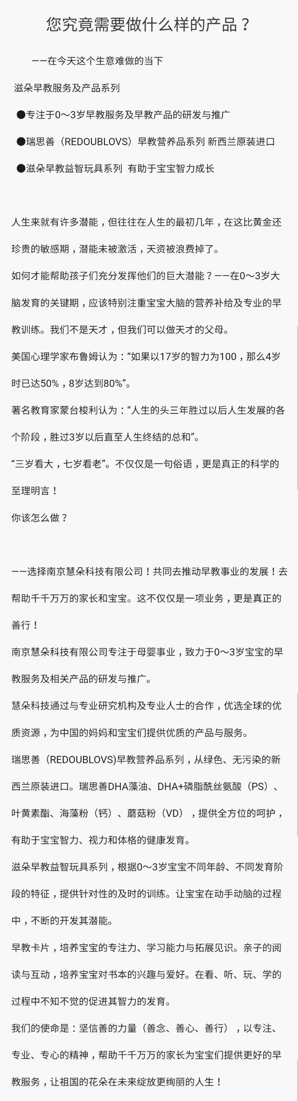 南京慧朵科技有限公司專注于母嬰事業(yè),致力于0~3歲寶寶的早教服務及相關產(chǎn)品的研發(fā)與推廣。