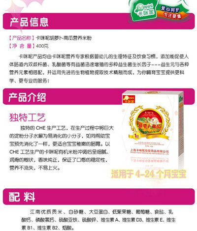 卡咪呢乳清蛋白嬰幼兒營養(yǎng)米粉是上海卡咪呢母嬰用品有限公司旗下產(chǎn)品,精選優(yōu)質(zhì)大米制作,特別添加乳清蛋白和益生元,提高寶寶抵抗力,促進(jìn)寶寶changdao的消化吸收,上市以來廣受父母消費(fèi)者的青睞。