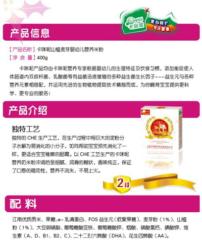 卡咪呢山楂麥芽嬰幼兒營養(yǎng)米粉是上海卡咪呢母嬰用品有限公司旗下產(chǎn)品,精選優(yōu)質(zhì)大米制作,搭配山楂和麥芽,由卡咪呢營養(yǎng)專家特別添加益生元與各種營養(yǎng)元素。山楂和麥芽都具有消食開胃的效果,讓寶寶越吃越開心。