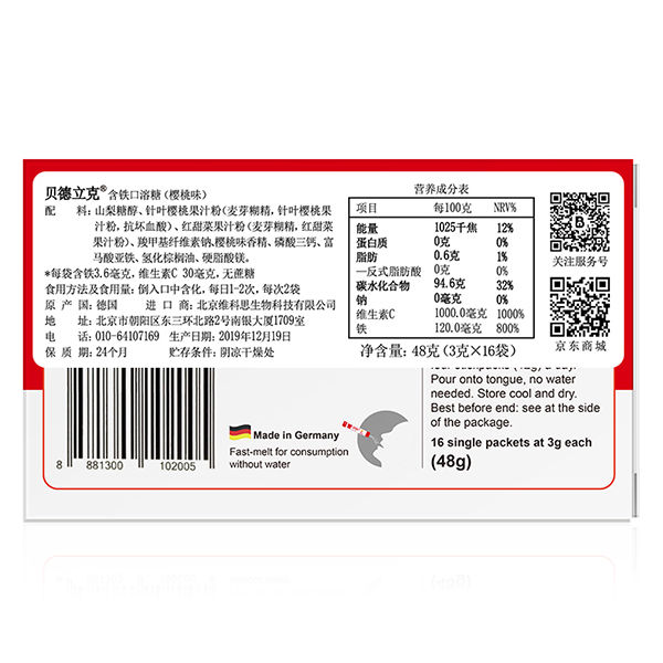 配料成分:木糖醇,糊精,針葉櫻桃果汁粉,紅甜菜果汁粉,羧甲基纖維素鈉,草莓香精,磷酸三鈣,富馬酸亞鐵,硬脂酸鎂。