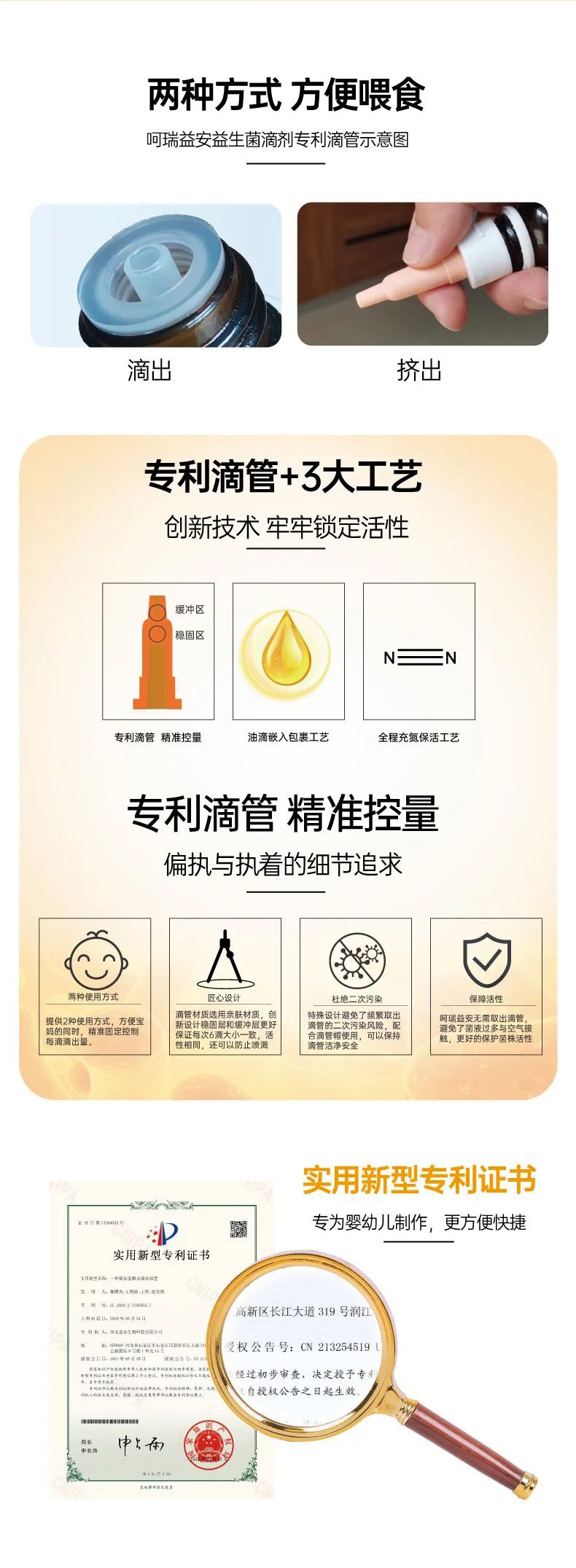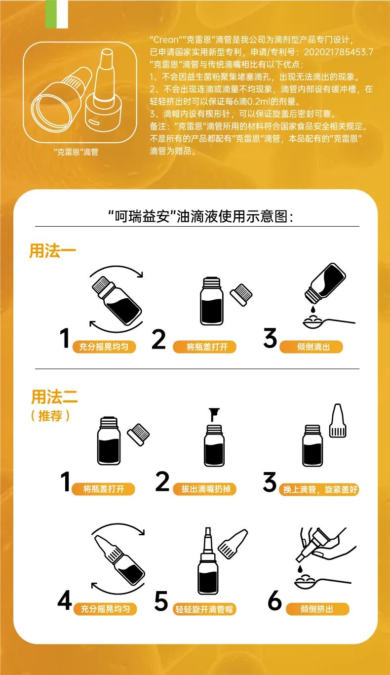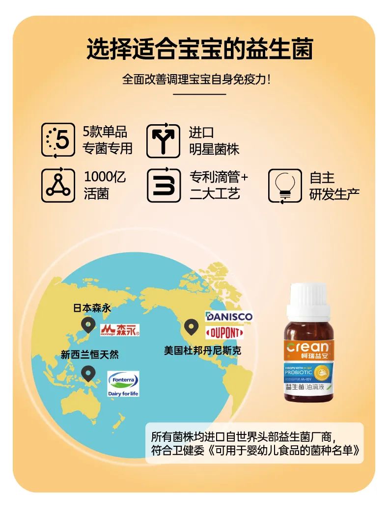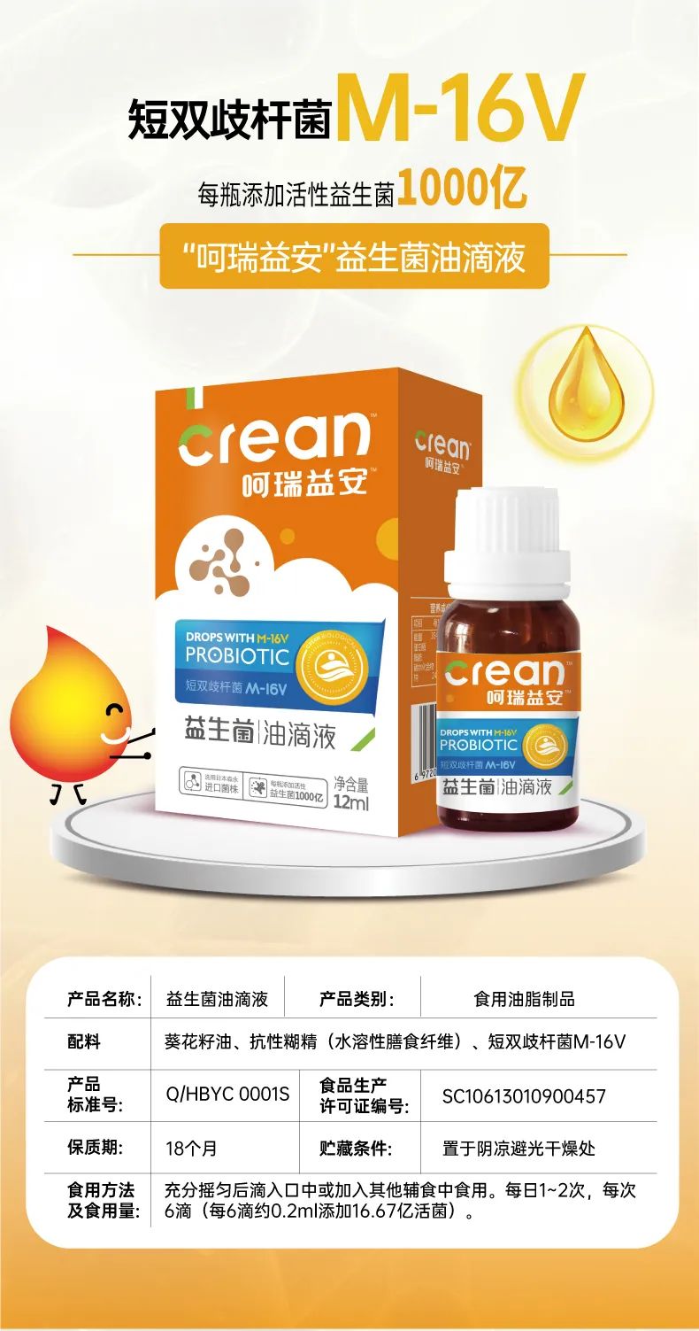 呵瑞益安短雙歧桿菌M-16V益生菌油滴液,采用進(jìn)口菌株,且選用菌株符合衛(wèi)健委【可用于yingye食品的菌種名單】。添加進(jìn)口原料,如瑞典AAK進(jìn)口油脂及進(jìn)口水溶性膳食纖維,安全配方,自主研發(fā)生產(chǎn),每瓶添加1000億活性益生菌,專利滴管,精準(zhǔn)控量,油滴嵌入包裹工藝+全程充氮;罟に,牢牢鎖定活性。