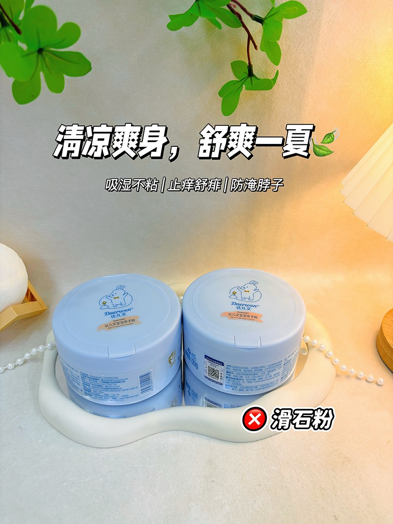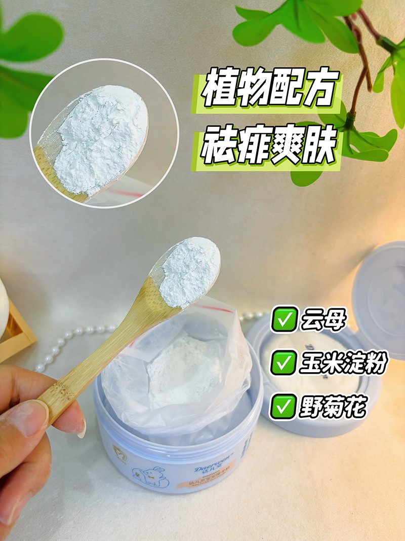 達(dá)兒文寶寶痱子粉,爽身防痱,有效隔離汗液,粉質(zhì)細(xì)膩,不溶于水,清涼干爽。