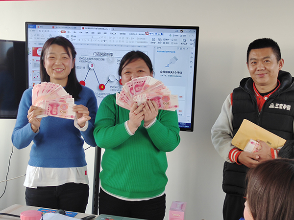 除了新品的講解,“施貝安”品牌針對線下門店所推出的門店獎勵方案亦是誠意滿滿,給銷售冠軍們的獎勵更是絲毫不含糊!白花花的百元大鈔送到各位銷售精英的手中,看著她們一個個洋溢著幸福的笑臉,亦是對“施貝安”品牌的高度認(rèn)可!