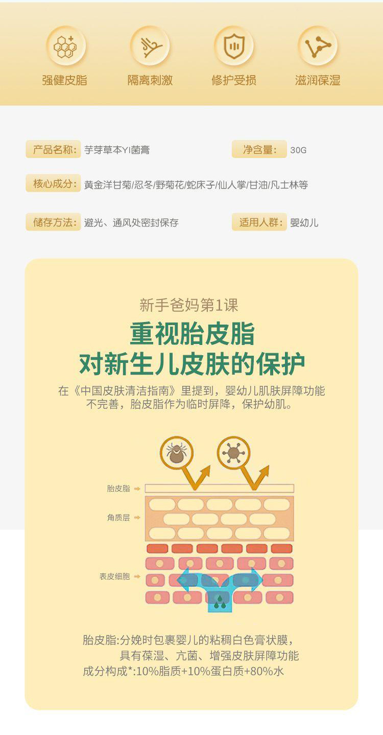 芋芽草本抑菌膏專注幼肌護(hù)理,草本萃取,植物成分,以金黃洋甘菊、忍冬、野菊花、蛇床子、仙人掌等提取物為核心成分,結(jié)合現(xiàn)代化科技,天然植物抑菌成分,緩解肌膚不適,修護(hù)肌膚受損,給嬌嫩肌膚更天然安全的防護(hù)。