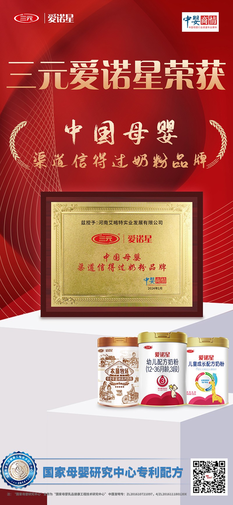 三元愛諾星是北京三元食品有限公司的知名品牌,隸屬于首農(nóng)集團(tuán),這是一家國(guó)有資產(chǎn)大型集團(tuán)公司。它是唯一一家“70年質(zhì)量0事故”的榮譽(yù)企業(yè),兩個(gè)國(guó)家級(jí)中心落戶三元 “國(guó)家奶牛胚胎工程技術(shù)研究中心”和“國(guó)家母嬰乳品健康工程技術(shù)研究中心”,榮獲國(guó)家科技進(jìn)步獎(jiǎng)40余項(xiàng),參與制訂國(guó)家標(biāo)準(zhǔn)70項(xiàng)。