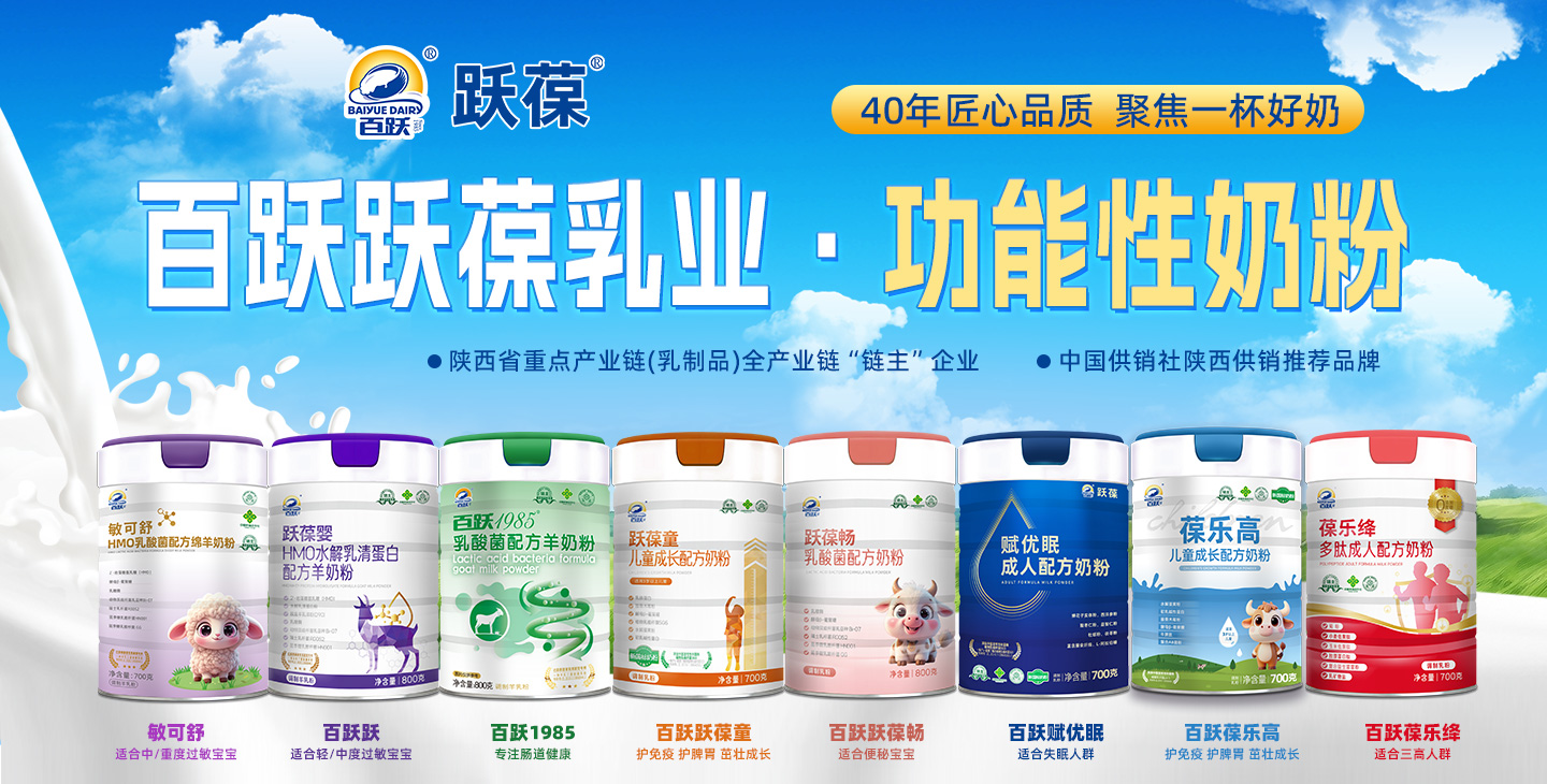 西安百躍躍葆乳業(yè)有限公司,是西安百躍羊乳集團(tuán)有限公司旗下控股子公司,專注于功能性特種乳粉的研發(fā)、生產(chǎn)、銷售及服務(wù)。作為乳制品行業(yè)資深企業(yè)百躍集團(tuán)的新銳力量,躍葆乳業(yè)依托母公司40余年羊乳制品生產(chǎn)經(jīng)驗(yàn)及全產(chǎn)業(yè)鏈優(yōu)勢(shì),采用國際先進(jìn)生產(chǎn)工藝和檢測(cè)技術(shù),致力于為消費(fèi)者提供鮮醇、營養(yǎng)、健康、好喝的乳粉產(chǎn)品。